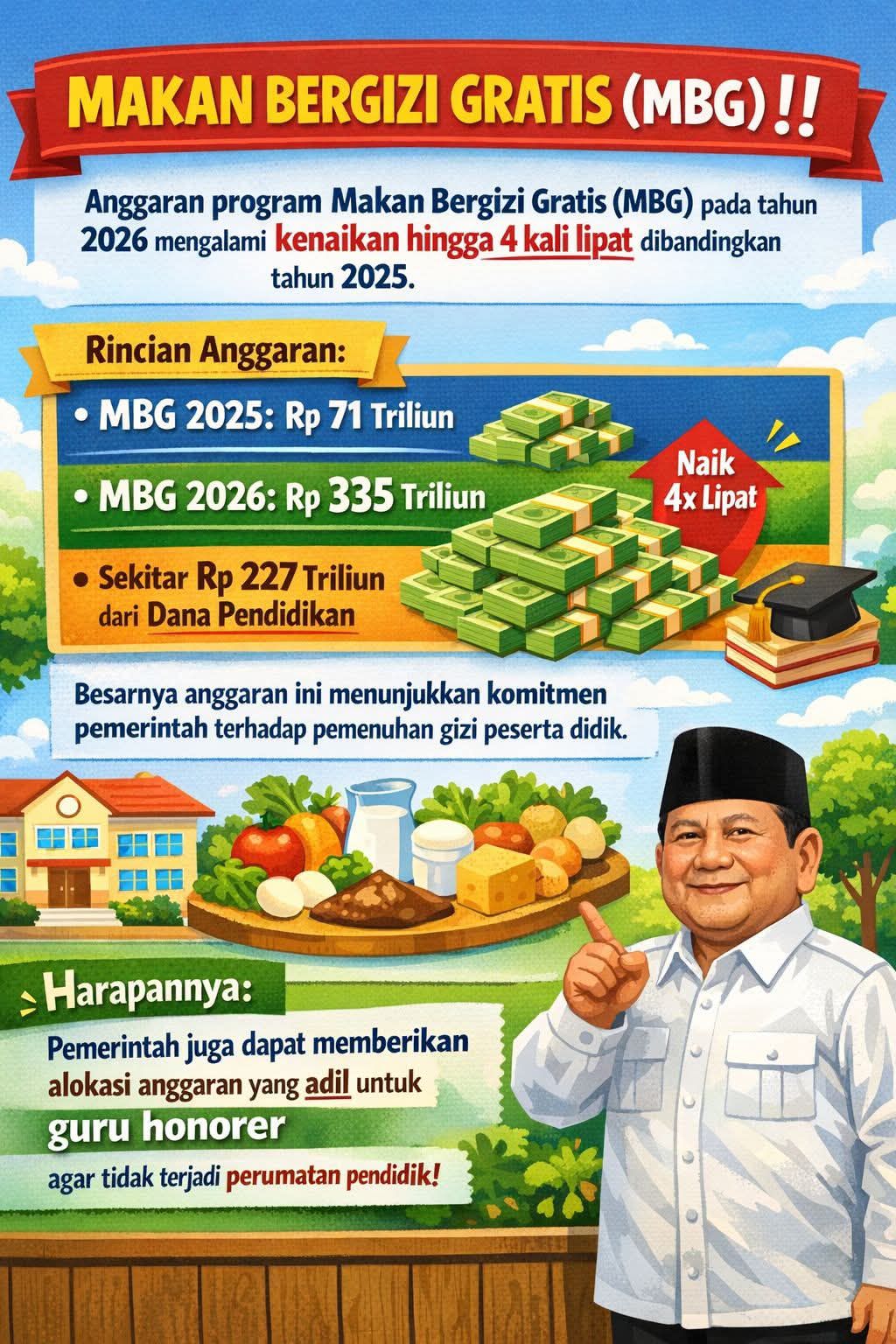 Di sisi lain, pemerintah menegaskan bahwa Program MBG bertujuan meningkatkan kualitas sumber daya manusia sejak usia dini melalui pemenuhan gizi anak sekolah, balita, serta ibu hamil dan menyusui. Program ini diyakini mampu memberikan dampak jangka panjang terhadap kesehatan, kecerdasan, dan produktivitas generasi mendatang. Meski demikian, besarnya nilai anggaran tetap memicu perdebatan mengenai efektivitas, transparansi, dan dasar hukum pengalokasiannya.